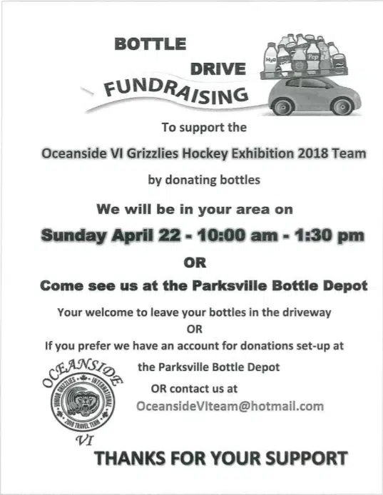 The Parksville Bottle & Recycling Depot is hosting a fundraiser in support of the Oceanside VI Grizzlies Hockey Exhibition!